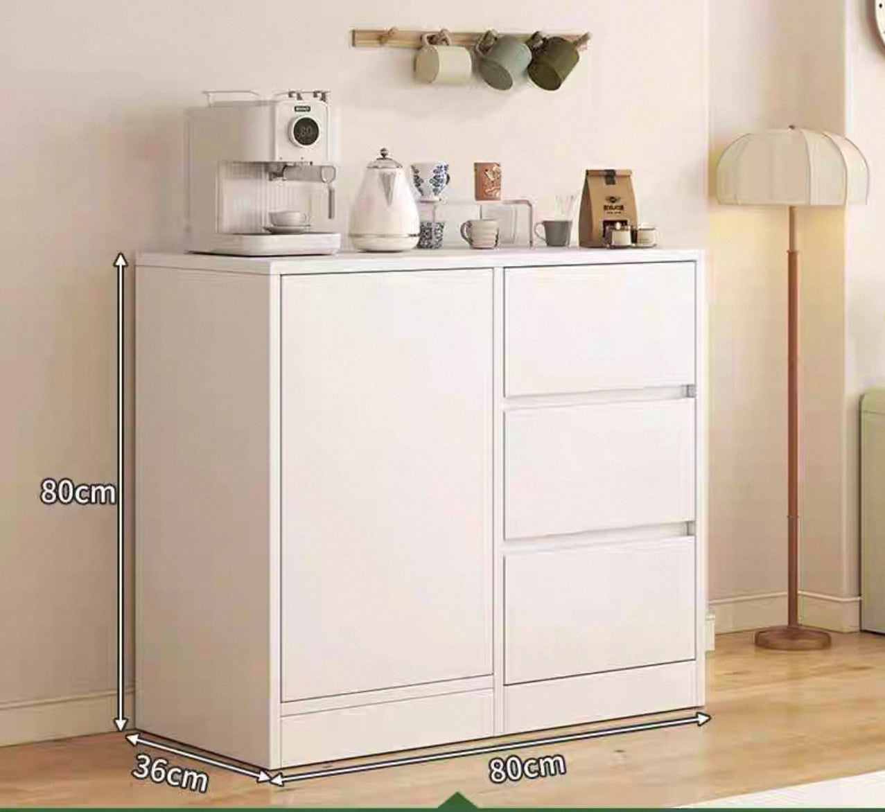 Ce buffet compact aux dimensions de 80 cm sur 80 cm est une solution idéale pour ceux qui recherchent à la fois praticité et élégance sans encombrer leur espace. Entièrement blanc, il s’intègre facilement dans tous les styles d’intérieur, du plus moderne au plus classique, en apportant une touche de luminosité et de sobriété.